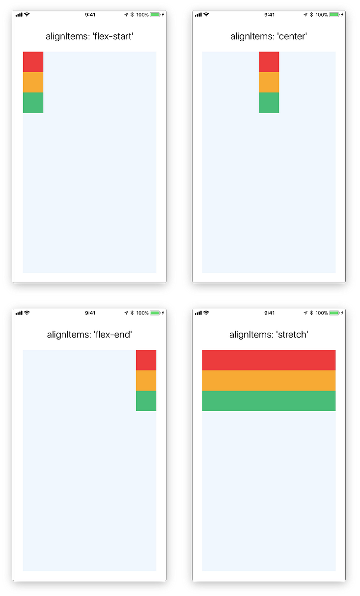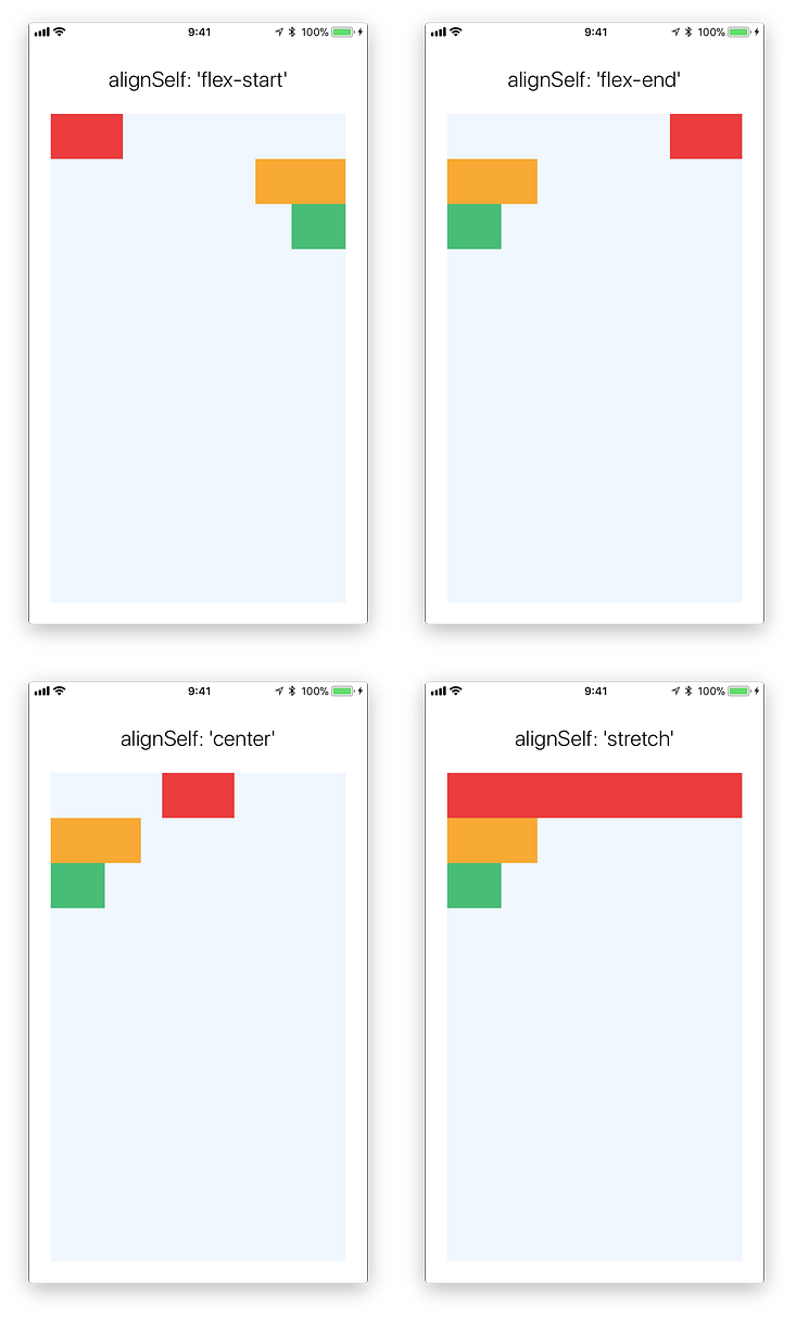 stretchtidak bekerja ketikawidthdari view sudah dispesifikasi.flex-startdanflex-endtidak akan mengerti apa yang harus dilakukan jika tidak ada spesifikasiwidth.