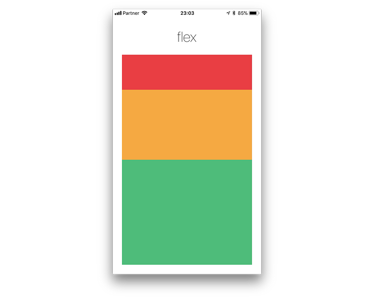 Ruang akan dibagi sesuai flex dari elemen di dalamnya. Contoh di bawah ini view merah, kuning, dan hijau adalah child dari container yang memiliki flex:1