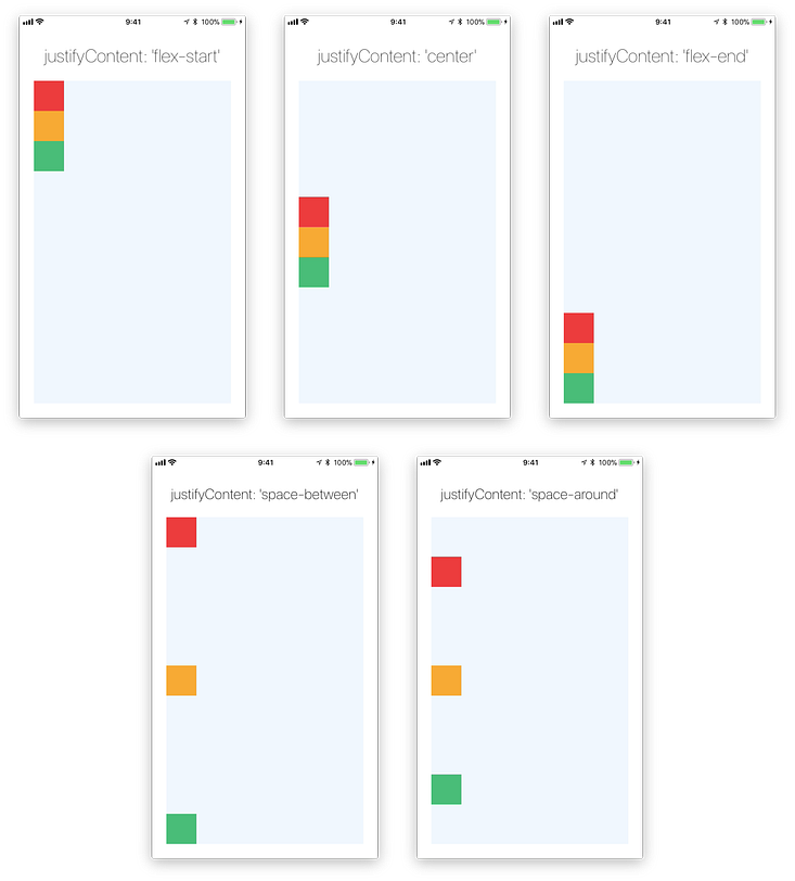 ‘flex-start’,’flex-end’,’center’,’space-between’,’space-around’